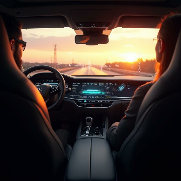 Software-definierte Fahrzeuge – Digitale Zukunft der Autoindustrie. Futuristisches Fahrzeugcockpit mit KI-Elementen und digitaler Software-Steuerung im 3:2-Format. Ein modernes, futuristisches Fahrzeuginterieur zeigt die Bedeutung von Software, künstlicher Intelligenz und digitalen Steuerungssystemen in der Automobilindustrie.